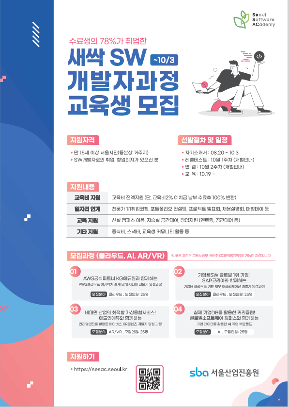 [서울특별시, SBA 서울산업진흥원] 첫해 수료생의 78%가 개발자로 데뷔한 SeSAC 코스에 초대합니다.(~10/03)