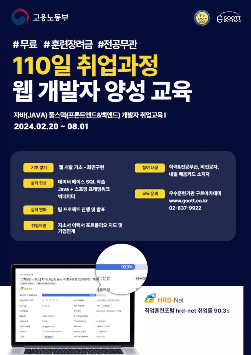 정보[국비무료] 전공무관 110일 웹 풀스택 개발자 취업과정 (프론트+백엔드) / hrd 평균취업률 90.3%