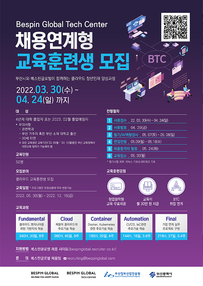 [전국]부산시와 베스핀글로벌이 함께하는 클라우드 청년인재 양성과정 채용연계형 교육훈련생 모집(~4/24)