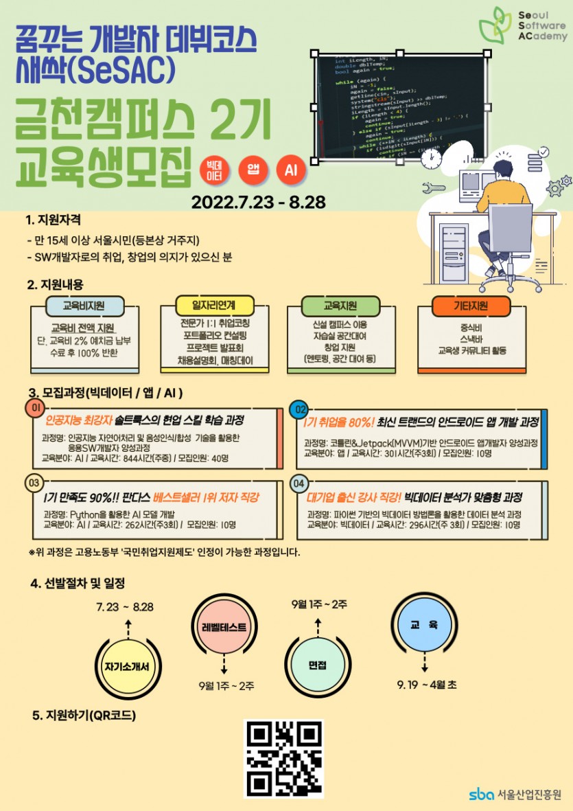 [서울시 x SBA] 꿈꾸는 개발자 대비코스 새싹(SeSAC) 금천캠퍼스 SW개발자 교육생 모집 (~8/28)