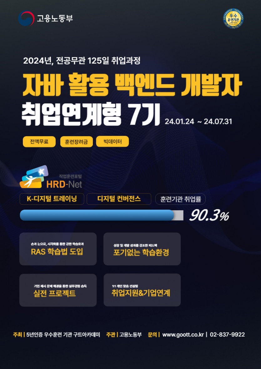 정보[취업연계형7기] hrd 90.3%, RAS기반교육 전공무관 웹 개발자 취업 과정 수강생 모집