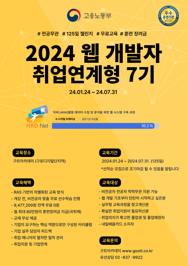 정보[채용연계7기] 전공무관 누구나 환영 / hrd 취업률90.3% RAS기반교육 개발자 취업과정 모집