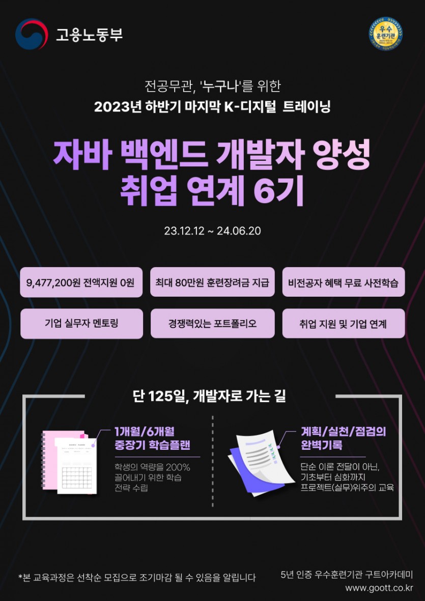 고용노동부인증 5년우수훈련기관 구트아카데미에서 커리어 전환을 시작할 예비개발자를 모집합니다!