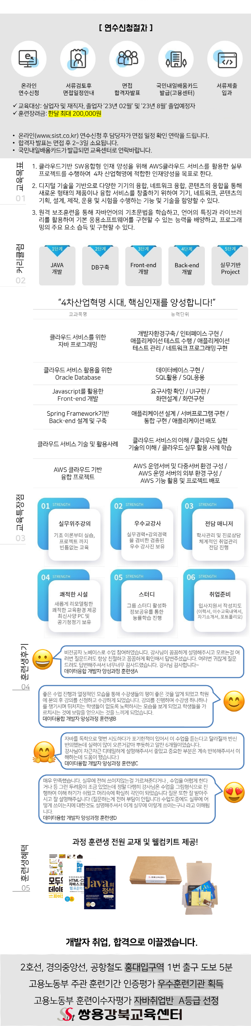 정보[쌍용강북교육센터][5/02개강](디지털컨버전스)자바&스프링기반 AWS클라우드 융합 개발자 양성과정(C) 홈 정보/팁/뉴스 정보 [쌍용강북교육센터][5/02개강](디지털컨버전스)자바&스프링기반 AWS클라우드 융합 개발자 양성과정(C) 페이지 정보 쌍용강북교육센터 쪽지보내기 메일보내기 자기소개 아이디로 검색 전체게시물 쪽지보내기 메일보내기 자기소개 아이디로 검색 전체게시물 작성일 23-04-12 09:49 868 0 관련링크 본문 교육과정 바로가기 ▶ 여기로! 교육문의▶ 카카오톡플러스친구 / 02-336-8546~8 추천 0 목록 댓글목록 목록