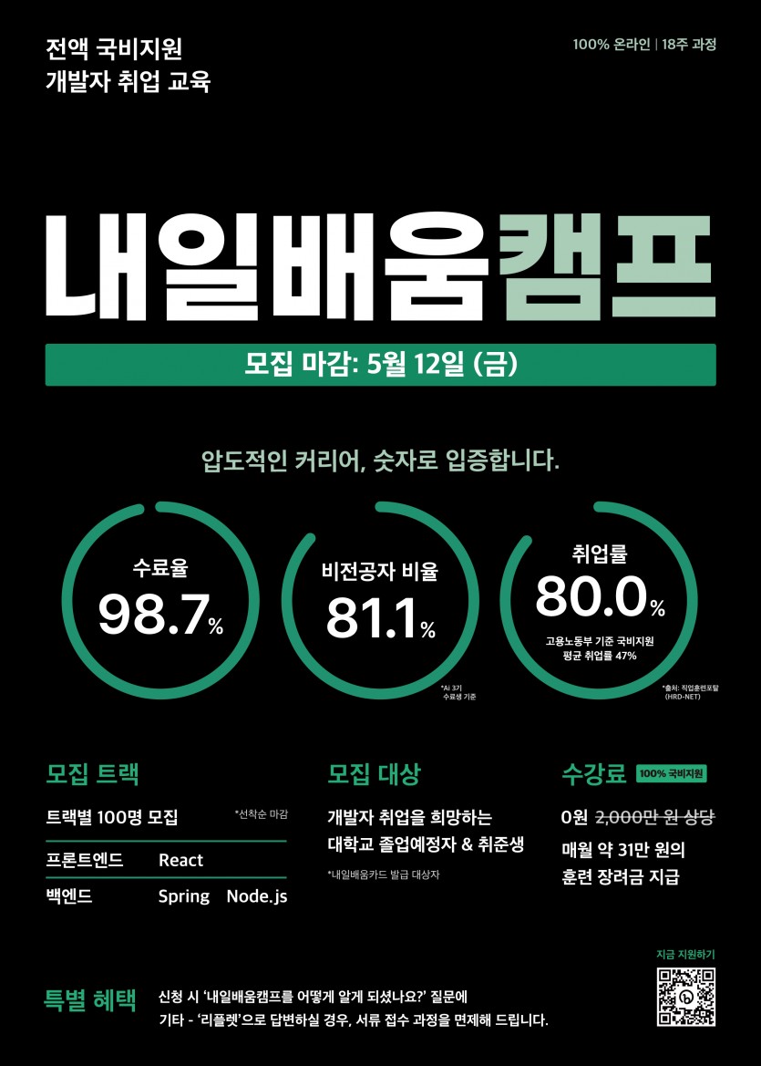 "국비지원 부트캠프 하나로 개발자 취업까지는 어려울까?" 비전공자여도, 개발 경험이 없어도 내일배움캠프에서는 괜찮습니다. 취업률 80%, 내일배움캠프는 개발자 취업까지 자신있습니다. 개발자 현업에 특화된 내일배움캠프 커리큘럼은 Microsoft, 배달의민족, 쿠팡, 카카오 등 업계 최고의 시니어 개발자와 1년 넘게 머리를 맞대어 고안하였습니다. 개발 학습부터 취업까지 한 번에 끝내는 all-in-one 국비지원 코스 2,000만원 상당의 개발 교육을 무료로 제공하는 내일배움캠프를 놓치지 마세요! ✔️ 실제 서비스 런칭을 경험하는 팀 프로젝트 ✔️ 현업 탑클래스 개발자 12시간 상주, 맞춤형 멘토링 ✔️ 전문 교육 매니저의 1:1 학습/커리어 관리 ✔️ 기간 제한 없는 취업 컨설팅, 1,000개+ 파트너사 삼성SDS, NHN 등 압도적인 아웃풋으로 증명합니다. 개발자 취업에 강한 내일배움캠프, 지금 지원하세요! * 조기마감이 예상되므로 서둘러주세요. http://bit.ly/40VoNsv