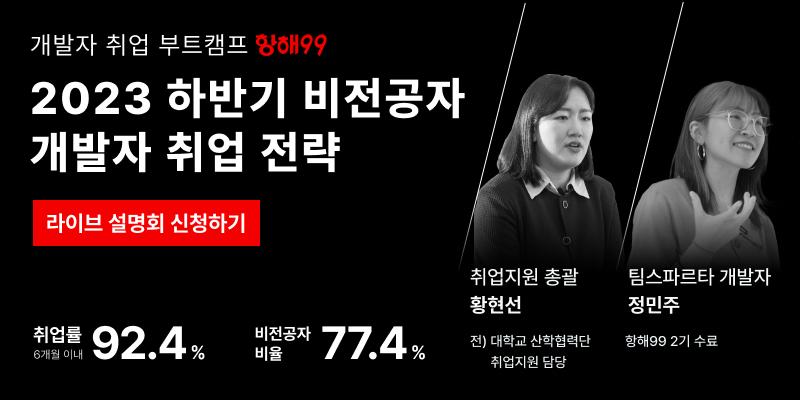 부트캠프 항해99가 비전공자도 2023년 하반기 "취업"까지 가능하게 할 모든 노하우를 공개합니다.