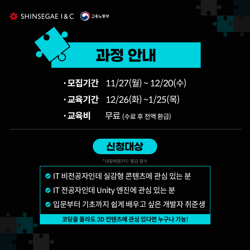 K-디지털기초역량훈련: 신세계아이앤씨 채용연계형 Unity를 활용한 3D 마스터 클래스과정(전공무관)(~12/20)