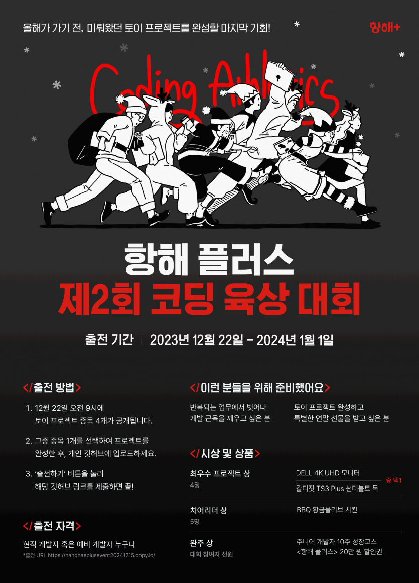 올해가 가기 전 토이프로젝트를 완성하고 포트폴리오를 쌓을 마지막 기회! 토이 프로젝트를 완성하여 개발 능력을 향상시키고, 특별한 연말 선물까지 받아가세요. 참가 대상 현직 개발자 또는 예비 개발자 도전 기간 2023.12.22(금)~ 2024.01.01(월) 우승자 발표 2024.01.08(월) 참가 종목 개발자의 고백 / 크리스마스 선물 월드컵 / 눈 닦기 / 신년카드 대회 상품 1. 최우수 프로젝트 상 : DELL 4K UHD 모니터 or 칼디짓 TS3 Plus 썬더볼트 독 2. 완주상 : 주니어 개발자 10주 선장코스 <항해 플러스> 20만원 할인권 3. 치어리더상 : BBQ 황금올리브 치킨 *) 자세한 상품은 홈페이지를 참고해주세요! 코육대 신청하기 https://hanghaeplusevent20241215.oopy.io/